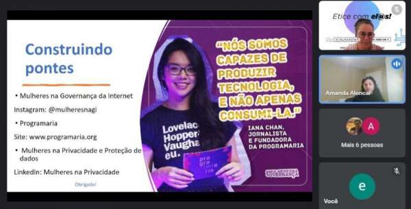 No período da tarde, a conversa foi transmitida on-line e mediada por Kátia Arruda, Analista de Governança e Comunicação do EGC. A advogada e consultora executiva da Law Society of Ireland, Amanda Alencar, comentou sobre discriminação algorítmica e iniciativas que buscam amenizar o cenário de discriminação contra mulheres na área de TI. Em seguida, Daphnee Iglesias, mestra em Políticas Públicas e German Chancellor Fellow, abordou o Dia do Empreendedorismo Feminino, ocorrido no mesmo dia 19, além de compartilhar suas vivências e dificuldades enquanto mulher vivendo fora do país, em uma área de atuação predominantemente masculina.