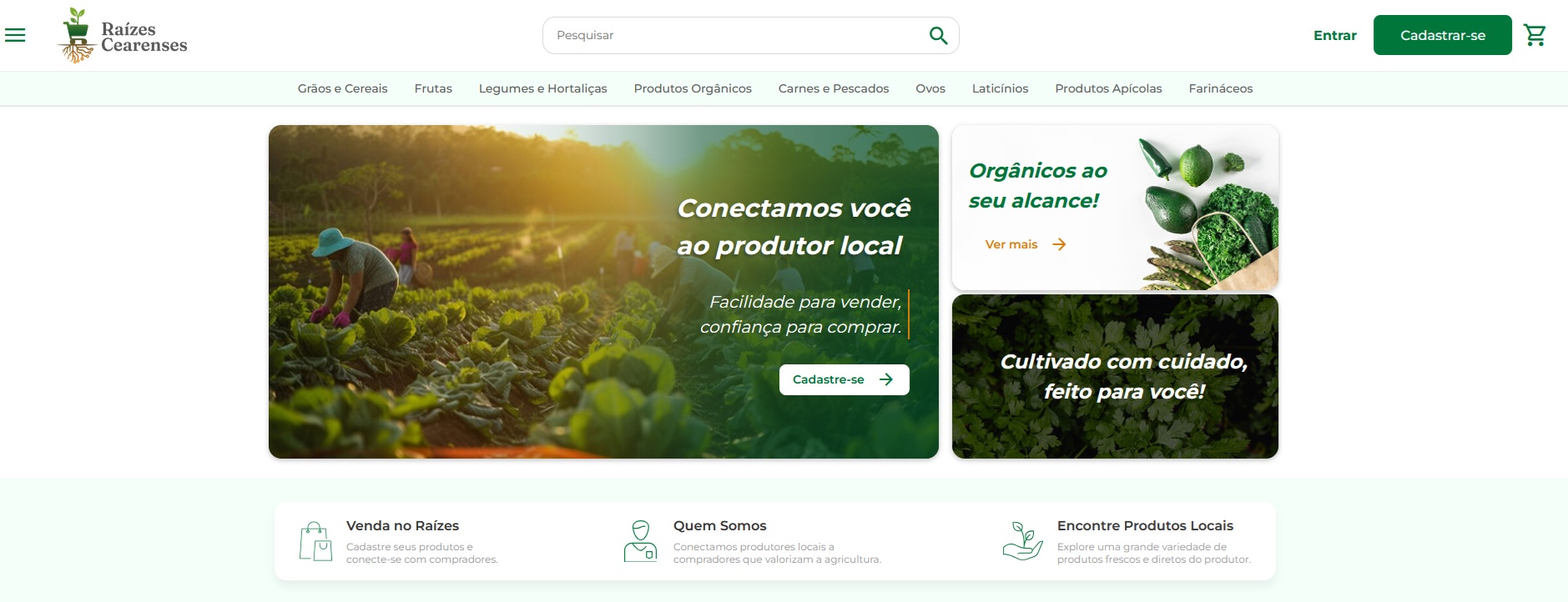 Com filtros por categoria, produtos orgânicos, região e selo do Ceará Sem Fome, além de notificações, carrinho de pedidos e newsletter, o Raízes Cearenses oferece uma navegação simples e eficiente tanto para quem produz quanto para quem compra.