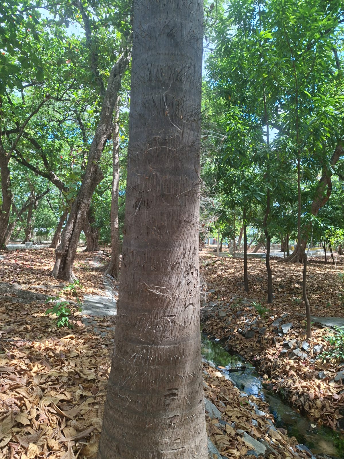 Seu Bernardo sabe de tudo do Parque, uma área de 7,7 hectares em frente à Empresa de Tecnologia da Informação do Ceará (Etice). Foi este senhor que me indicou um dos pés de macaúba onde tinha visto, pela manhã, frutos caídos no chão. Foi com surpresa que identifiquei esta palmeira de espinhos grandes nesta área verde em pleno bairro São João do Tauape.