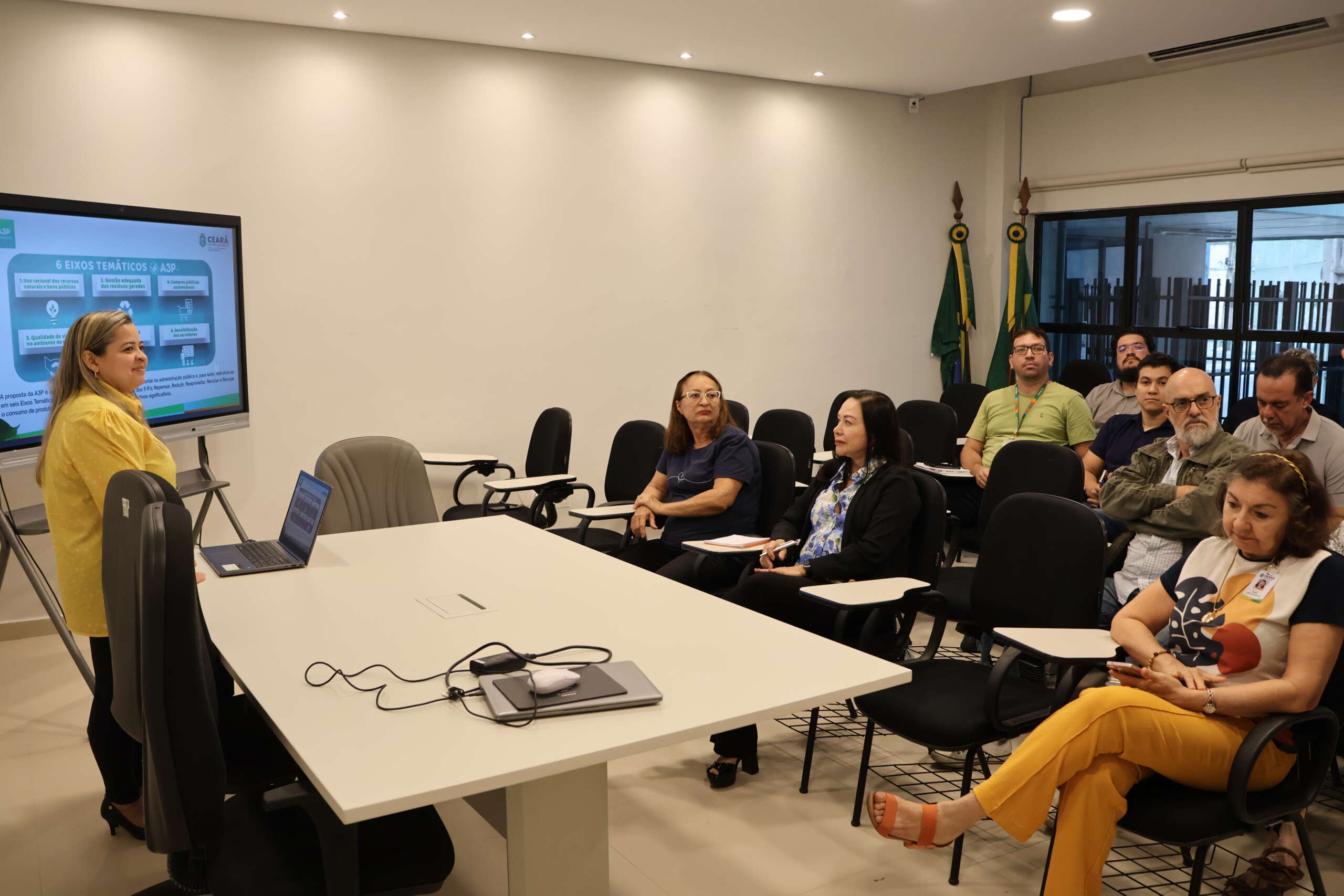 A Empresa de Tecnologia da Informação do Ceará (Etice) recebeu, na tarde desta sexta-feira (6), em sua sala de treinamentos, a técnica da Secretaria Estadual do Meio Ambiente e Mudança do Clima (SEMA), Magla Holanda, que discorreu sobre o processo de como a Empresa pode aderir à Agenda Ambiental da Administração Pública (A3P), um programa do Ministério do Meio Ambiente e que no Ceará é coordenado pela Sema. Por parte da Etice, o evento teve a coordenação da Gerência de Qualidade, Segurança, Meio Ambiente e Saúde (GEQSMS), representada por Sílvia Kataoka e Priscilla Dias.