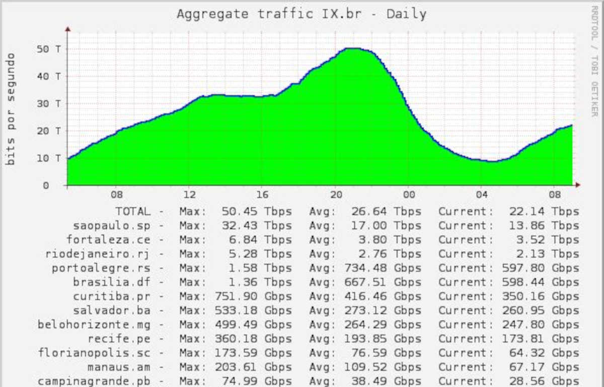 O ponto de troca de tráfego de Fortaleza do IX.br é o segundo maior do Brasil, com 3,52 Tbps, enquanto o Rio de Janeiro aparece em terceiro lugar, com 2,13 Tbps. São Paulo lidera com 32 Tbps e concentra o maior número de participantes.